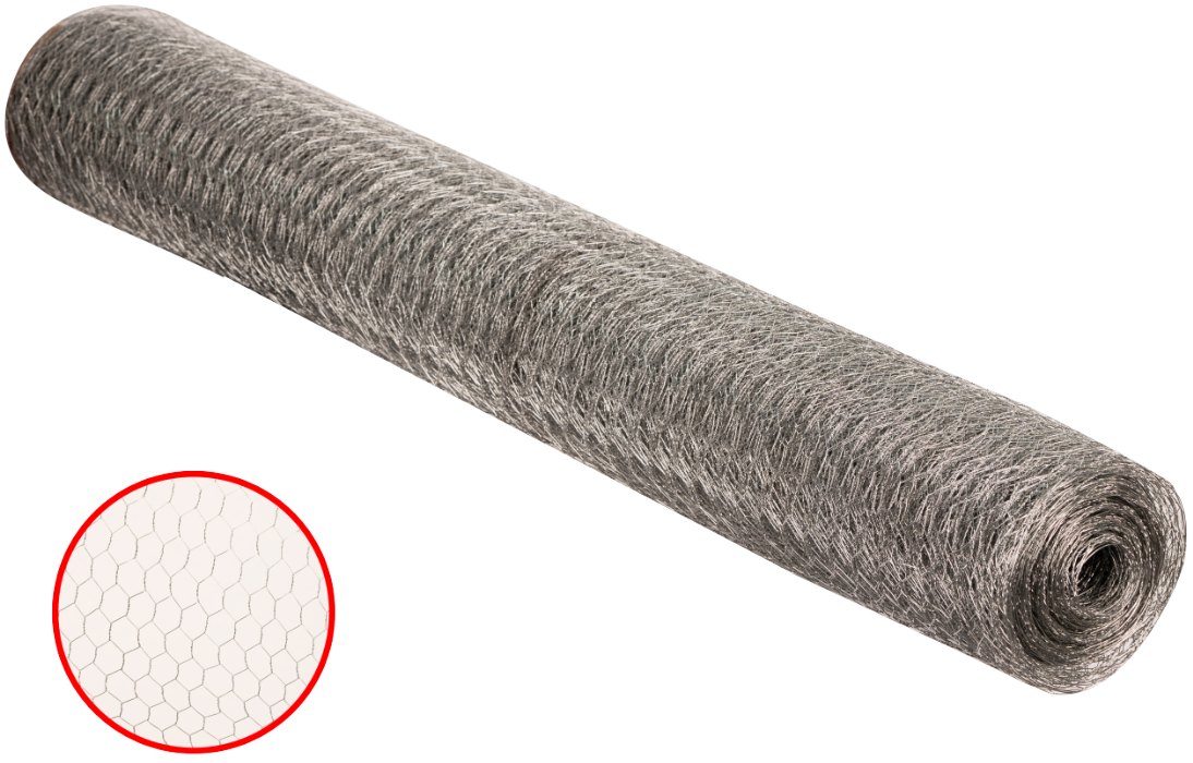 Rete Rabitz realizzata con fili di ferro a doppia zincatura per una maggiore resistenza alla ruggine, intrecciata con maglie esagonali da 20 mm.