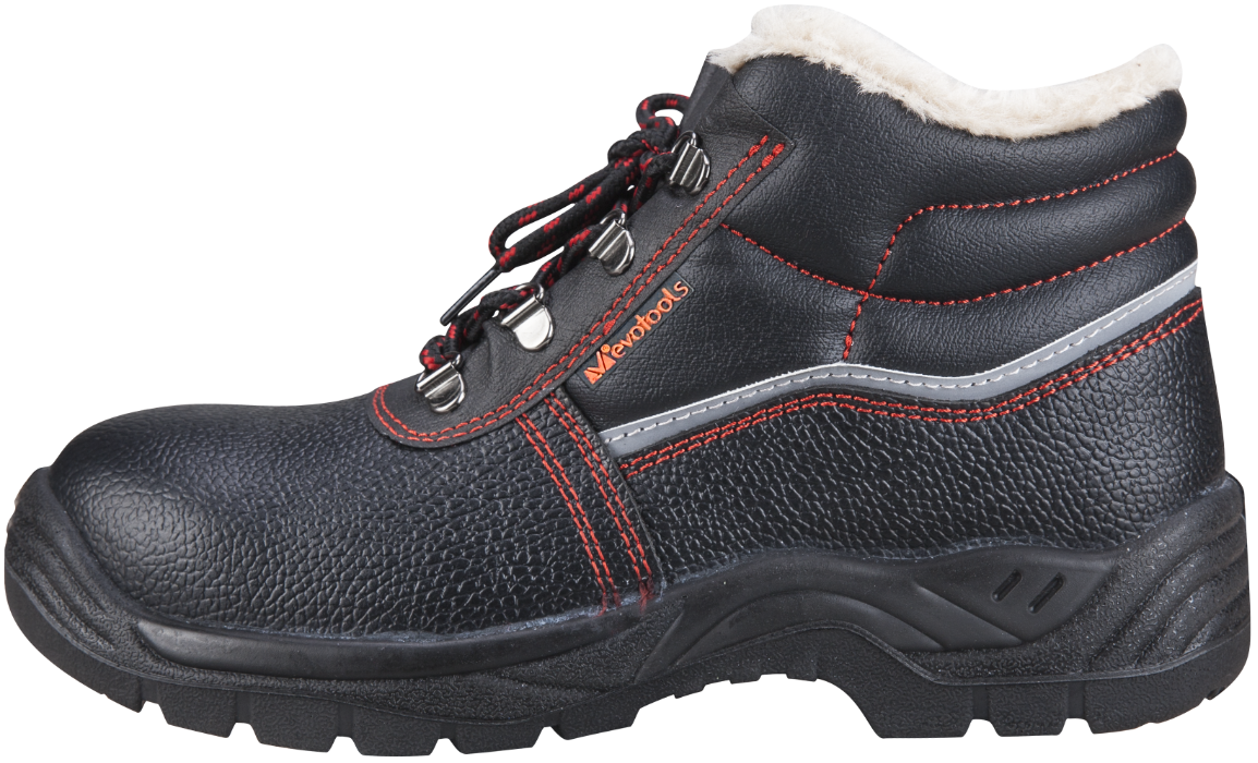 Scarponi di sicurezza con puntale in metallo, dotati di lamina antiperforazione in acciaio e suola in PU iniettato, antiscivolo e resistente agli oli, con fodera interna in pelliccia sintetica per un maggiore comfort termico.