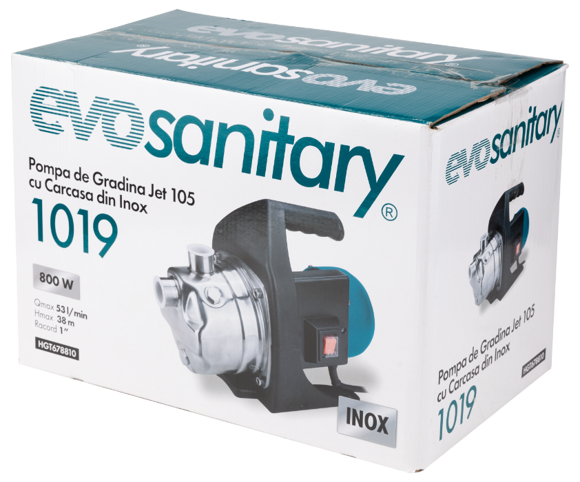 Con una potenza di 800 W, la pompa può estrarre acqua da una profondità fino a 8 m e pompare fino a un'altezza massima di 38 m, garantendo una portata massima di 53 L/min.